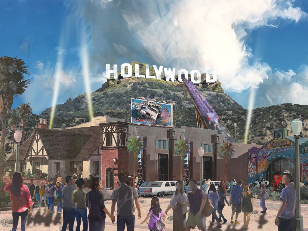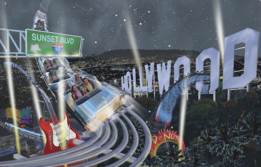 I started with what I knew about RnRC while thinking about what was broken in the area as it currently existed, and that proved remarkable simple. The existing land was barren, lacking greenery and filled with hard and uninteresting surfaces. The design manifest was to duplicate the Spider-man ride, reimagine Rock n Roller Coaster and fix the land giving it a story and supporting background. Prior to confirming Spider-man, there was a development to repurpose the Armageddon attraction as well as duplicating and importing another ride that had premiered elsewhere. Due to NDA just like Bruno we don’t talk about those ideas.